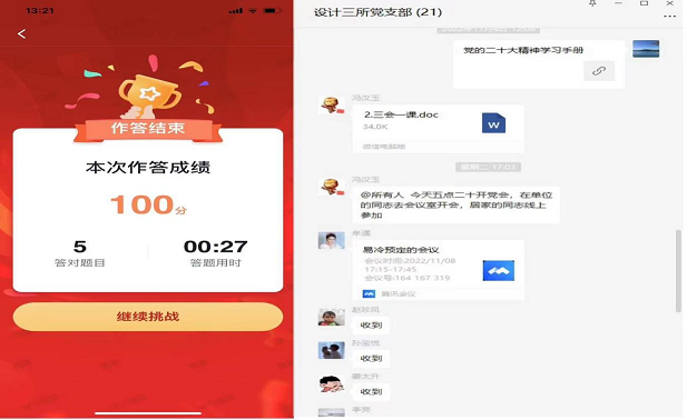 豐富載體,營造濃厚學習氛圍。各基層黨支部通過開展“三會一課”,轉發主流媒體報道,分享學習輔導資料,線上線下引導黨員通過積極參與集體學習、線上答題、視頻學習等形式,拓寬學習渠道,豐富學習載體,全方位、深層次、多途徑開展黨的二十大精神學習宣傳工作,多措并舉營造學習黨的二十大精神的濃厚氛圍。