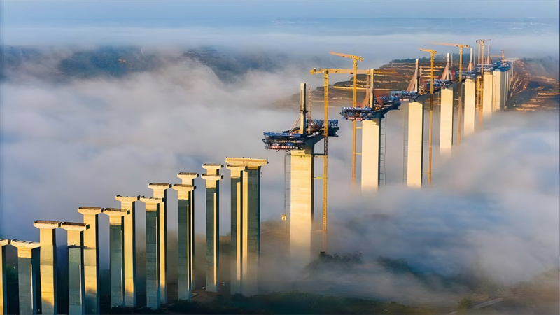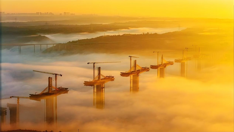 晨光初現,建設中的橋梁在薄霧中若隱若現,跨越河流、連接兩岸,為隴東大地經濟騰飛插上翅膀。