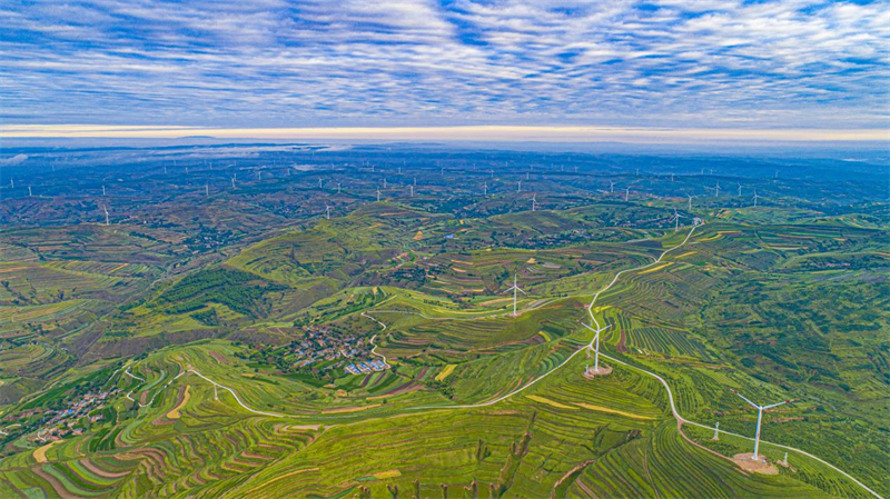 梯田蜿蜒起伏,村莊錯落有致,云海連綿不絕,風車悠然旋轉,織就了人與自然和諧共生的美麗畫卷。