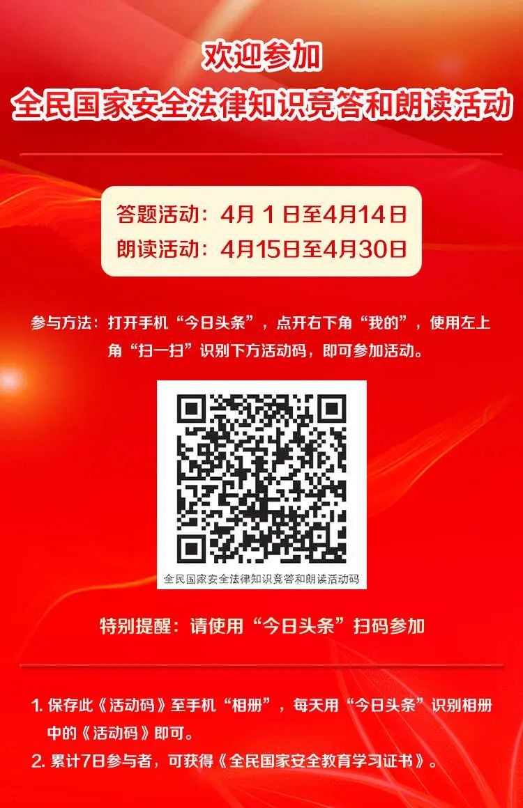 今年是國(guó)家安全法頒布施行10周年,4月15日是第十個(gè)全民國(guó)家安全教育日。為深入貫徹落實(shí)習(xí)近平總書(shū)記關(guān)于全面加強(qiáng)國(guó)家安全教育的重要指示批示精神,推進(jìn)國(guó)家安全法治宣傳教育走深走實(shí),增強(qiáng)全民國(guó)家安全意識(shí)和法治意識(shí),倡議大家參加全民國(guó)家安全法律知識(shí)競(jìng)答和朗讀活動(dòng)。