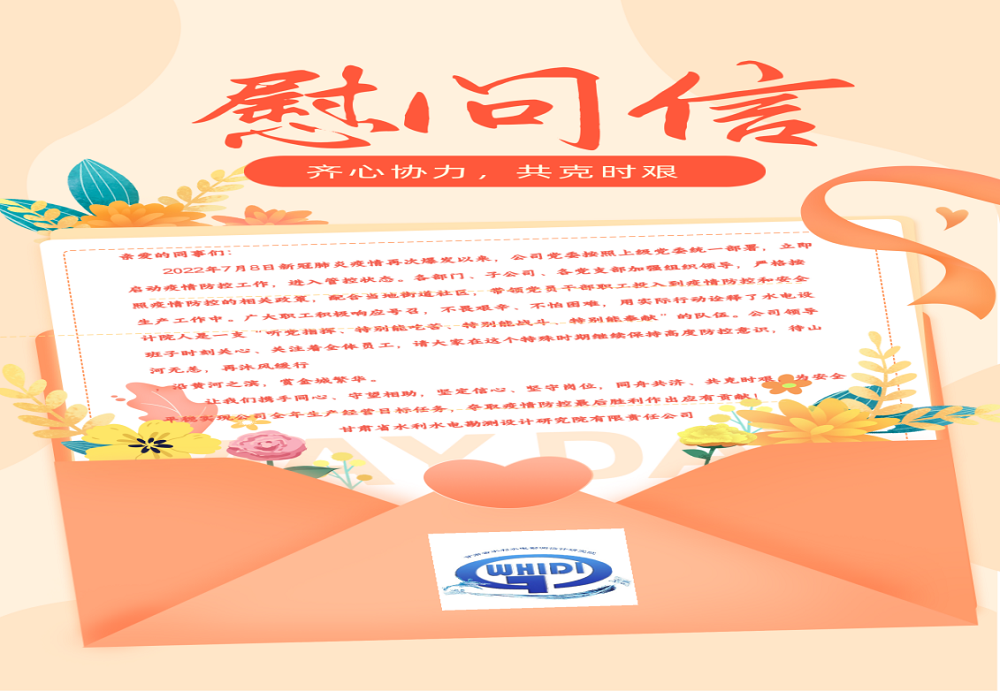 同時,注重加強人文關懷。水電設計院黨委對集中隔離的員工進行了一對一電話連線慰問,并向全體員工致信,對堅守一線員工、志愿者和居家辦公人員給予鼓勵,鼓舞大家消除不安緊張情緒,提振精神、鼓舞士氣,動員廣大員工積極配合和參與疫情防控,及時做好心理疏導,保證員工隊伍情緒穩定。