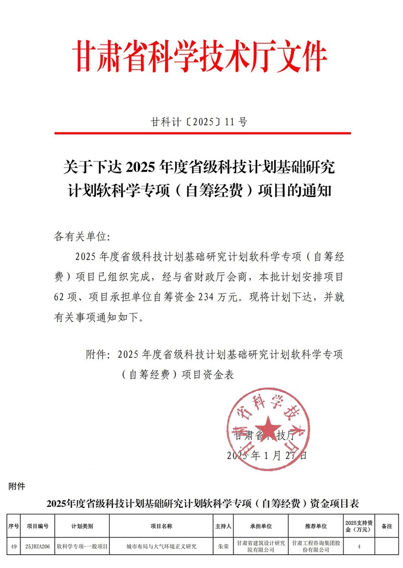 近日,甘肅省科技廳公布了2025年省級科技計(jì)劃基礎(chǔ)研究計(jì)劃軟科學(xué)專項(xiàng)(自籌經(jīng)費(fèi))項(xiàng)目立項(xiàng)結(jié)果,省建筑設(shè)計(jì)院申報(bào)的“城市布局與大氣環(huán)境正義研究”項(xiàng)目獲批立項(xiàng)。