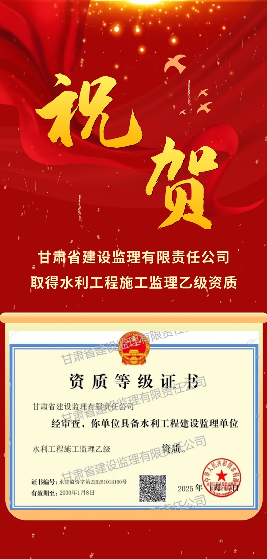 省建設監理公司取得水利工程施工監理乙級資質